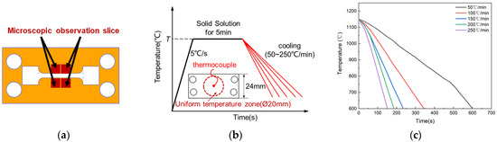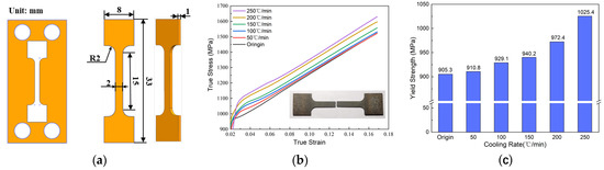- Within the solid solution cooling rate range of 50–250 °C/min, it was observed that the yield strength of tensile specimens made from high-temperature alloys increases with an increase in the solid solution cooling rate, achieving a maximum enhancement of 12.58%. The stress–strain curves exhibit pronounced work-hardening behavior, while tensile specimens display characteristics indicative of brittle fracture.