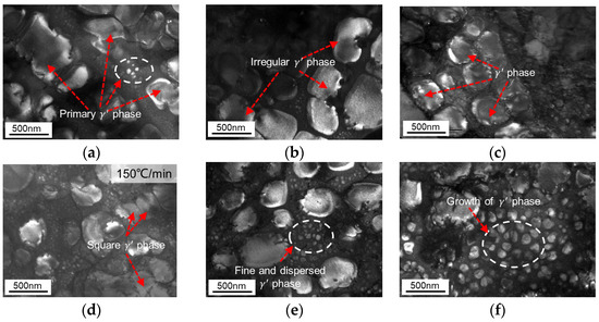 - Selected regions corresponding to γ′-phase particles were filled with red color, allowing for subsequent calculations of equivalent diameter and area for each individual γ′ phase particle using ImageJ software. The results obtained were further processed using Origin 2021 to determine both the grain size and volume fraction of the γ′ phase across varying heat treatment cooling rates. In considering grain sizes within this analysis, grains exceeding 500 nm in diameter observed in images were classified as part of a γ/γ′-phase eutectic structure and thus excluded from statistical evaluation.