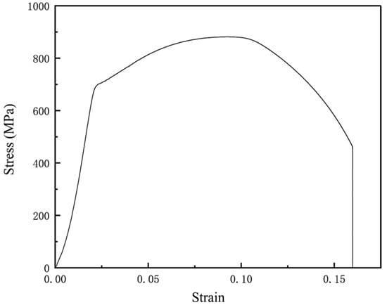 The hardness of such material was assessed by using a standard Vickers hardness tester (HVS-50, Shimadzu, Kyoto, Japan), with a loading time of 15 s and a loading force of 0.25 N. The average hardness value obtained was 455 HV at room temperature. For tensile testing, a Shimadzu Universal Testing Machine with a model of AG-X plus, Shimadzu, Japan was employed at a tensile rate of , which gave a maximum tensile force of 100 kN. The tensile tests were conducted in accordance with the ASTM E8/E8M standard []. The tensile curves obtained from the tests are shown in Figure 2, indicating that the alloy’s ultimate tensile strength and yield strength are approximately 881.4 MPa and 717.2 MPa, respectively.