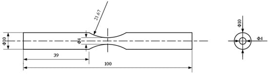 The detailed dimensions of the rotational bending fatigue test specimen are shown in Figure 3, with a specimen length of 100 mm and a rounded corner radius of 21.67 mm. Before the fatigue test, the specimen surface was carefully polished mechanically using sandpapers with grit sizes of 300#, 600#, and 1000# to achieve the desired surface roughness.
