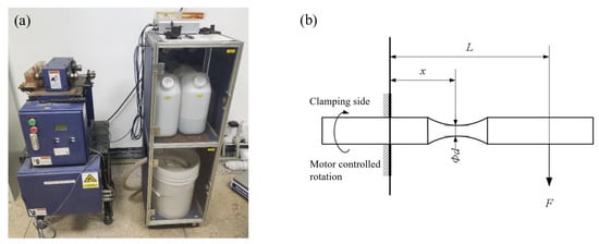 In the rotational bending fatigue test, the specimen is subjected to cyclic loading by fixing one end and rotating the other end, based on the cantilever principle. A weight is applied to the free end to induce a bending moment, as shown in Figure 4. Specifically, Figure 4a illustrates the test machine setup, while Figure 4b provides a detailed schematic of the specimen configuration. The tests were conducted at a rotational frequency of 100 Hz in air and 5 Hz in water, considering the time-dependent nature of corrosion in aqueous environments.