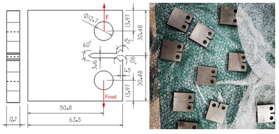 The CT (Compact Tension) samples were prepared in accordance with the ASTM E647 standard [], as shown in Figure 5. Initial cracks were systematically introduced using a fatigue loading method to ensure a uniform crack growth from a predetermined position. The samples were securely mounted to prevent any displacement or tilting during loading.