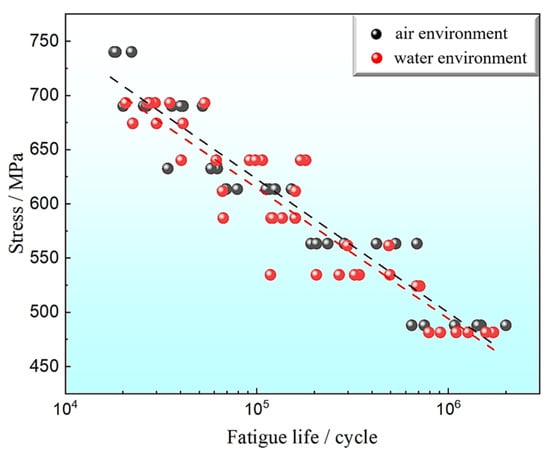 Figure 6 presents the S-N (stress–life) curves for the material tested in both air and water environments. As expected, the fatigue life decreases with increasing stress levels, following the typical downward trend observed in the fatigue curves, with the fatigue life ranging from 104 to 107 cycles. In the water environment, the fatigue life similarly decreases as stress increases, but the decline is more pronounced compared to that in air. The regression line in the water environment has a steeper slope, indicating that the material is more susceptible to fatigue failure in the water environment due to the corrosive effects of the aqueous environment. Under a stress amplitude of 475 MPa, the fatigue life in the water environment was reduced by approximately 10.3% compared to that in air. This finding is consistent with previous studies on the fatigue behavior of stainless steel and aluminum alloys, which have shown a significant reduction in fatigue life under corrosive conditions compared to air [,].