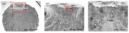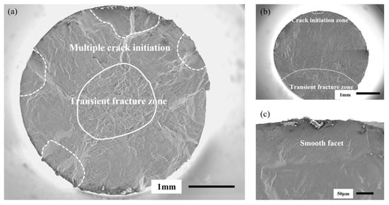 In this study, the fatigue experiments were conducted on specimens in both air and water environments, with surface crack initiation being a common feature. Figure 7a illustrates the fracture surface morphology of a specimen that failed under cyclic loading of 690 MPa in air. It can be seen that the multiple fatigue cracks are clearly visible, originating from the specimen surface and propagating inward. The final transient fracture zone is located centrally within the sample. Research has indicated that under high stress levels, fatigue cracks are more likely to initiate at multiple points []. This leads to a competitive merging process between neighboring cracks, with each crack having a limited propagation area, thereby resulting in a reduced fatigue life. As shown in Figure 7b, the number of fatigue crack initiation sites decreases with decreasing loading stress in the air environment. A closer examination of the crack initiation region, as depicted in Figure 7c, reveals a small, smooth plane. It has been reported that under low stress conditions, crack initiation is influenced by the maximum shear stress, with grains slipping along favorable orientations []. Thus, the formation of these smooth, small planes in the crack initiation region observed in the experiment is likely related to grain slip.