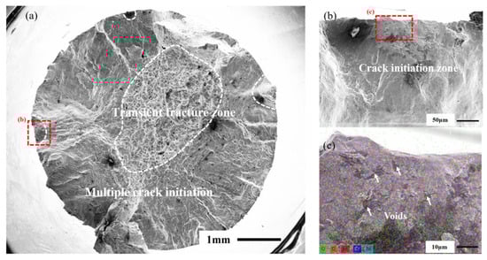 Figure 8 presents the fracture morphology of fatigue failure in an aqueous environment. Similar to the observations in air, crack initiation under high-stress cyclic loading occurs at multiple surface points, as depicted in Figure 8a. Upon closer inspection of one of these initiation sites, it is evident that the surface is not as flat and smooth as in air, with numerous dark areas visible, as shown in Figure 8b. The smoother fracture zone observed in air conditions is mainly due to the absence of corrosion effects in air. In the water environment, corrosion leads to the formation of corrosion products and secondary cracks, which roughen the fracture surface. These corrosion-induced features accelerate crack initiation and propagation, resulting in a more irregular fracture morphology. These dark areas are likely indicative of corrosion that occurred during fatigue loading in the water environment.