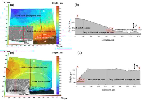 Three-dimensional morphology and section profile of the fracture. (a) Fatigue fracture in air conditions at σα = 563.3 MPa and Nf = 5.31 × 105 cycles; (b) section profile of marked line A-B in (a); (c) fatigue fracture in water conditions at σα = 481.4 MPa and Nf = 1.27 × 106 cycles; (d) section profile of marked line A-B in (c).