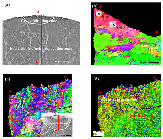 In ultra-high-cycle fatigue experiments in air conditions, the crack initiation phase is highly susceptible to maximum shear stress []. Figure 10a illustrates a typical fatigue fracture surface in air, while Figure 10b presents the IPF results for section A-B of Figure 10a. The results indicate that cracks slip along the densest {110} plane of the bcc lattice due to maximum shear stress. Comparing the grain boundaries in the IPF results with Figure 10a, it is evident that crack initiation involves slip within a single grain, while some grains in the early propagation region continue to slip along the {110} plane under maximum shear stress. Since crack initiation and early propagation account for the majority of the fatigue life [,], these findings underscore the significant impact of maximum shear stress in air on fatigue life. Additionally, analyzing the shape and size of grains in the crack initiation region reveals that fatigue damage in air tends to originate within reverse-transformed austenite. Moreover, the analysis of grain morphology and size in the crack initiation region reveals that fatigue damage in air preferentially originates within reverse-transformed austenite regions, which may act as localized weak zones due to their distinct mechanical properties compared to the surrounding martensitic matrix. This highlights the critical role of microstructural heterogeneity in governing fatigue crack nucleation in air conditions.