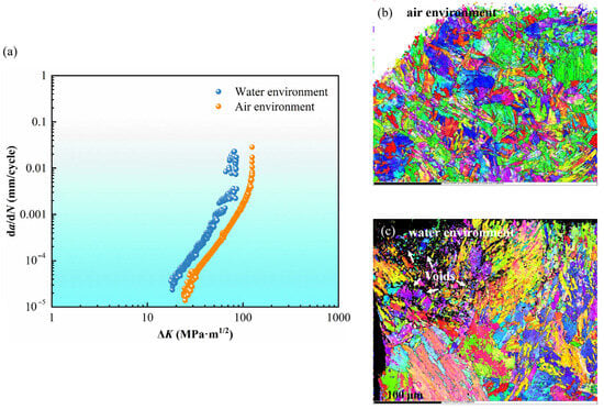 The crack expansion and EBSD results investigations of crack sprouting. (a) da/dN-ΔK results in air environment and water environments; (b) EBSD results of crack sprouting flanks in air environment; (c) lateral EBSD results of crack sprouting in water environment.