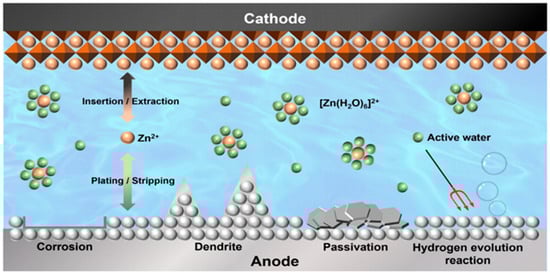 As a zinc-based secondary battery, AZIBs typically employ metallic zinc as the anode, a weakly acidic aqueous electrolyte containing Zn2+ ions [,], and cathode materials with multi-ion channels (e.g., tunnel or layered structures with large interlayer spacing) []. Recent breakthroughs in cathode materials—including manganese-based compounds, vanadium-based compounds, MXenes (2D transition metal carbides/nitrides), Prussian blue analogs (PBAs), and organic compounds which have expanded the possibilities for AZIBs []. Future research will continue to clarify the ion insertion mechanism and develop advanced anode materials [].