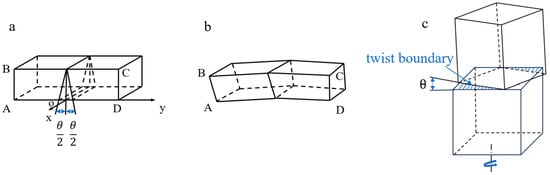 Schematic illustrations of formation processes for different low-angle grain boundaries. (a,b) Evolution of symmetric tilt boundaries showing (a) pre-tilt and (b) post-tilt configurations; (c) formation mechanism of twist boundaries through rotational misorientation.