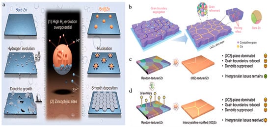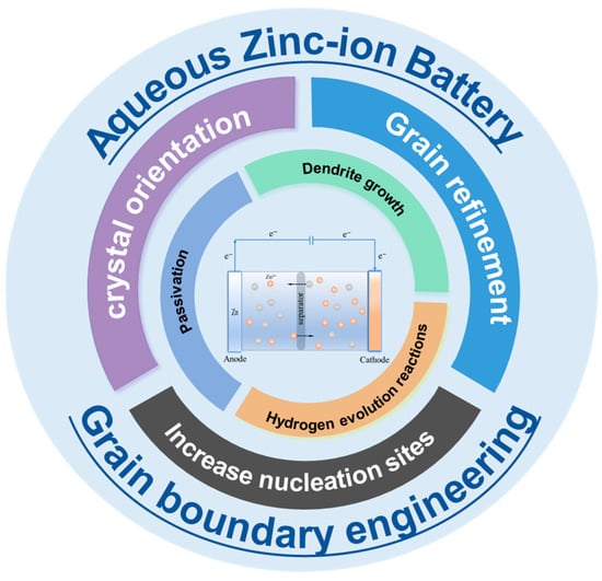 In recent years, GBE has demonstrated encouraging success in lithium alloy anodes, offering a novel strategy for modifying AZIB anodes [,]. As a critical microstructural feature in polycrystalline materials, grain boundaries (GBs), the fundamental structural units connecting crystalline grains, directly influence the mechanical properties, electrochemical activity, and ion transport behavior of metals through their density, orientation, and chemical states. Compared to crystalline planes, GBs exhibit heightened reactivity []. Studies reveal that localized corrosion typically initiates at GBs before propagating into grain interiors, ultimately leading to irreversible intergranular corrosion [,]. Consequently, tailoring GB characteristics can significantly enhance the uniformity of zinc deposition. High-density GBs provide abundant nucleation sites, suppressing dendritic preferential growth; controlled GB orientations reduce diffusion energy barriers for zinc atoms, promoting planar deposition; alloying element doping modulates GB energy states, mitigating parasitic reactions. Furthermore, synergistic integration of grain boundary engineering (GBE) with surface modification and electrolyte additive strategies has substantially improved the overall performance of AZIB anodes.