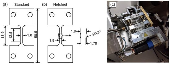 The (a) standard (smooth) and (b) notched miniature dog-bone specimen drawings; dimensions are in mm. (c) MTI tensile stage (Reprinted with permission from Ref. [26]. Copyright 2025 Elsevier).