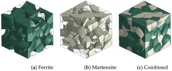 To build the idealized RVE using data extracted from the microstructure (Table 2), Digimat software was used. There are several options for creating an RVE for dual-phase materials. The first option, called ‘Generic’ in Digimat, involves a matrix with a high-volume fraction and a second phase with a low-volume fraction. Various geometries, such as spheres, ellipsoids, and prisms, can be used for the precipitates. However, this method is not accurate for materials with a high fraction in the second phase, like DP980GA, which contained 47% martensite in this study. Therefore, the ‘Metal’ option in the software was used instead. This approach constructs the RVE to resemble a metal microstructure with individual grains. The input data included the volume fraction of phases, average grain size, grain size distribution (assumed to be normal), and the number of grains. Determining the number of grains can be tricky, as it dictates the minimum 3D RVE size and must be established through trial and error to achieve the desired RVE dimensions. Each grain corresponds to one of the phases, as shown in Figure 2, which illustrates ferrite and martensite grains separately and together. After building, meshing, and applying the Periodic Boundary Conditions (PBC) to the RVE in Digimat, the ABAQUS input file was generated and imported into ABAQUS for solving. Uniaxial displacement was applied along the X-axis. On CentOS Linux 7, typical run times range between 1 and 2 h when using eight cores (Intel® Xeon® CPU E5-2697 v2 @ 2.70 GHz × 48).