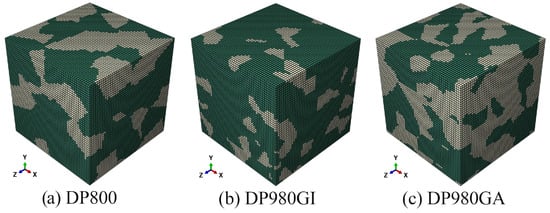 Final meshed RVEs for (a) DP800, (b) DP980GI, and (c) DP980GA.