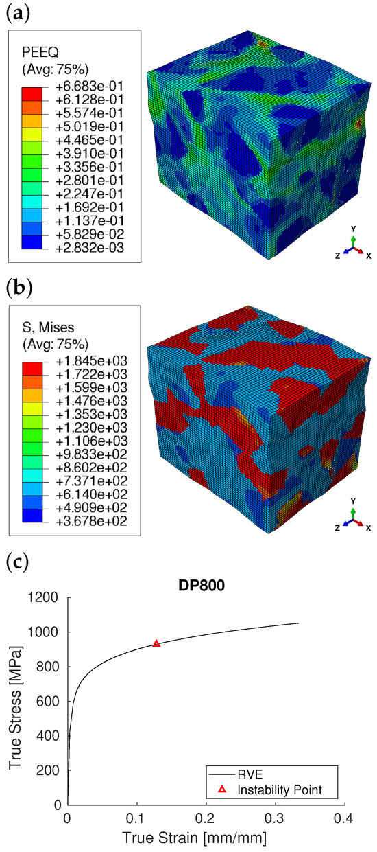 DP800 RVE under uniaxial displacement along the X-direction; (a) equivalent plastic strain contour; (b) Von-Mises stress contour; (c) resultant true stress–strain curve and the instability point.
