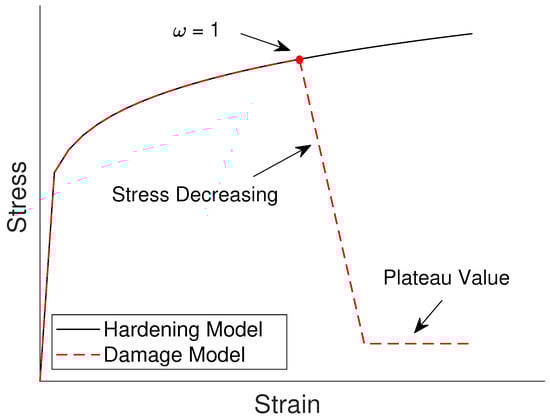 where represents the increment in the equivalent plastic strain. Hence, accumulated damage is provided by . When the accumulated damage variable reaches the critical value , ductile failure is assumed, and incremental crack growth is simulated by sharply reducing all stress components to a small plateau value, as shown schematically in Figure 5. Reducing stresses to zero can cause numerical issues; therefore, stresses are maintained at a finite (cut-off) value [22]. The cut-off value and decreasing slope in this work were chosen to be 10% of the yield strength [22] and 1/2000, respectively. Equation (1) includes three parameters—A, B, and To estimate these parameters experimentally, multiple tensile tests at various levels of triaxiality are required; Nam et al. [28]. However, when such test data is unavailable, C is set to 1.5 based on the result from Rice and Tracey [23].