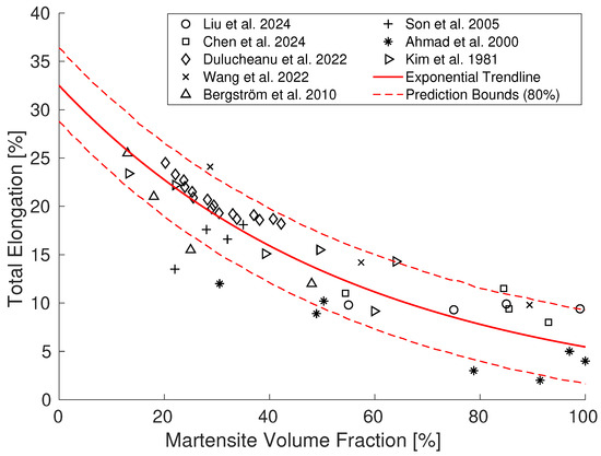 Data from the literature on failure in DP steels, including studies by Liu [30], Chen [31], Dulucheanu et al. [32], Wang [33], Bergstrom et al. [34], Son et al. [35], Ahmad et al. [36] and Kim et al. [37], are shown in Figure 7, where the relationship between the volume fraction of martensite and total elongation for various DP steels is plotted. Trendlines are shown in the figure and, for zero percent martensite, the failure strain is well bounded between 30 and 35%.