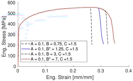 Effect of varying the damage parameter B on the stress–strain curve for pure ferrite (for DP800). The values correspond to low-strain and high-strain ferrite.