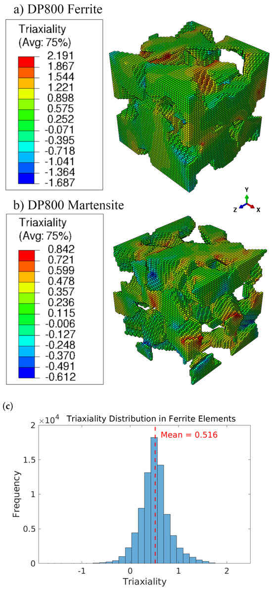 Triaxiality distribution in the RVE at the instability point for DP800, (a) Ferrite region, (b) Martensite region, and (c) Triaxiality histogram of ferrite elements.