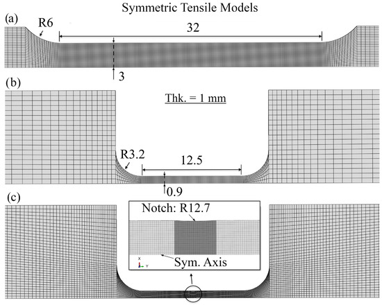 Symmetric models of tensile specimens: (a) subsize ASTM E8; (b) smooth/standard miniature dog-bone; (c) notched miniature dog-bone.
