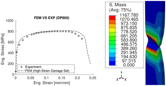 Figure 11 shows a comparison of the the full FE stress–strain curve for DP800 using subsize ASTM E8 geometry and the experimental curve. For this result, the damage parameters A, B, C, and D were set to 0.1, 7, 1.5, and 1.56, respectively, as shown in Table 3 and Table 4. The peak load signifies the onset of necking in the tensile specimen, and the von-Mises stress gradually concentrated in the necking region. Once an element reached the critical damage value of unity, the stress relaxed to a plateau value. For example, the blue elements in the necking area in Figure 11 relaxed.