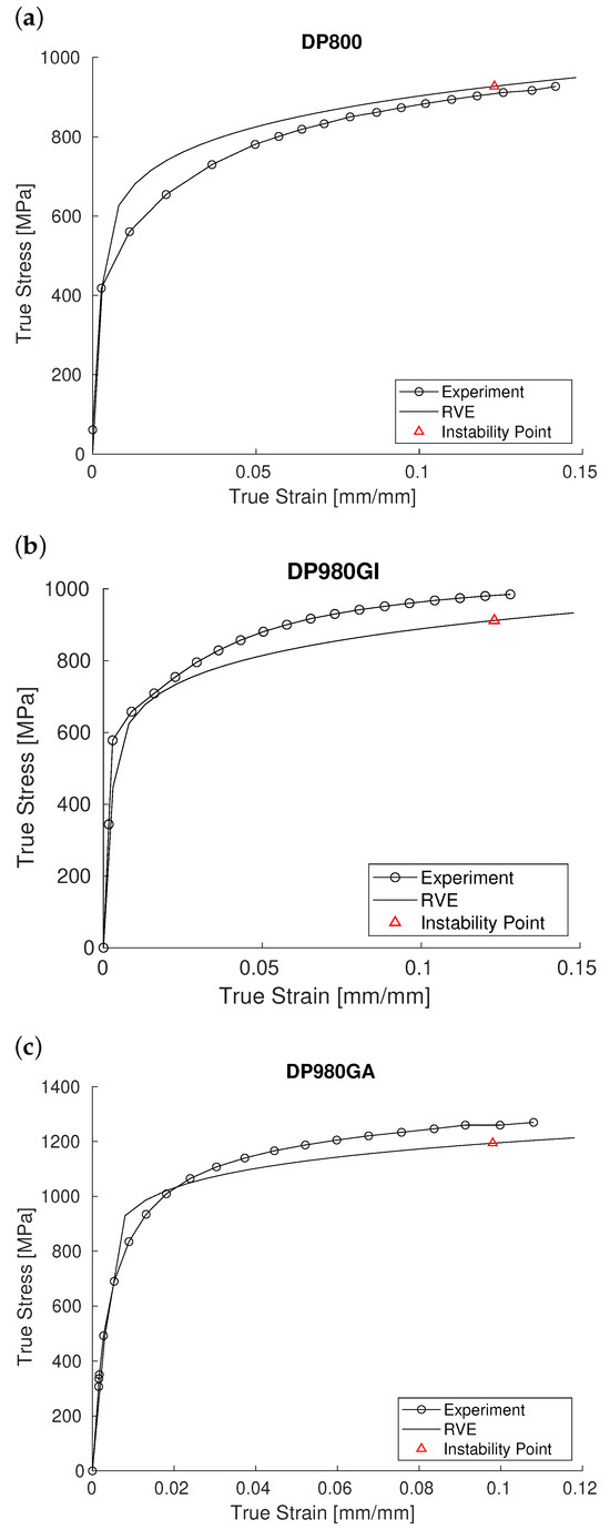 Comparison of the the results generated from idealized RVEs for the DP grades with experimental true stress–strain curves, (a) DP800, (b) DP980GI, and (c) DP980GA; red markers indicate the point of instability based on the Considère criterion.