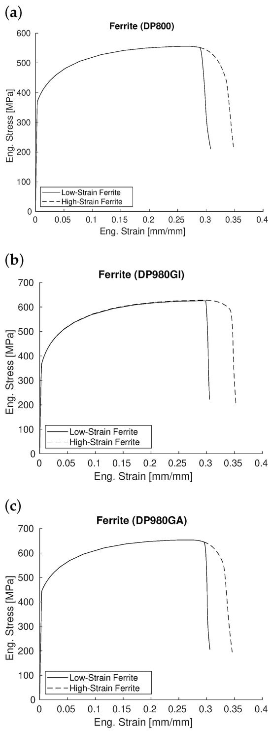 Engineering stress–strain curves for pure ferrite, obtained from an FE simulation of uniaxial tensile specimen using the UHARD damage subroutine: (a) DP800, (b) DP980GI, and (c) DP980GA.