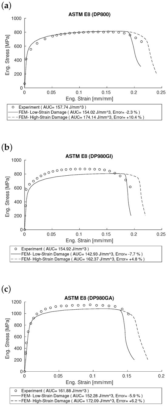The FE stress–strain curves for a sub-size ASTM E8 geometry generated for DP800, DP980GI, and DP980GA were compared with the experimental results of the uniaxial tensile test in Figure 14. The corresponding area under the curve (AUC), representing the absorbed energy for each of the FE results and experiments, was calculated and recorded in the figure legend. A general review of Figure 14 and its legend indicates that, for the three DP grades—DP800, DP980GI, and DP980GA—both the low-strain and high-strain damage parameters from Table 3 predicted the absorbed energy reliably, within an error range of 10%. The lowest error was observed for the DP800 low-strain damage set, which obtained a negative error of 2.3% compared to the experiment, while the highest error was found for the DP800 high-strain damage set, with a positive error of 10.4%, which is still considered an acceptable estimation.