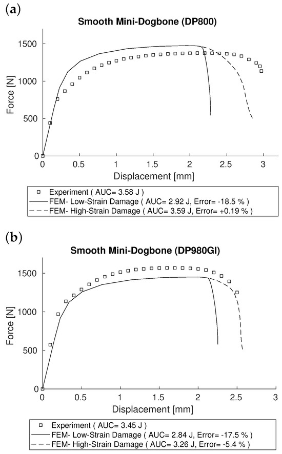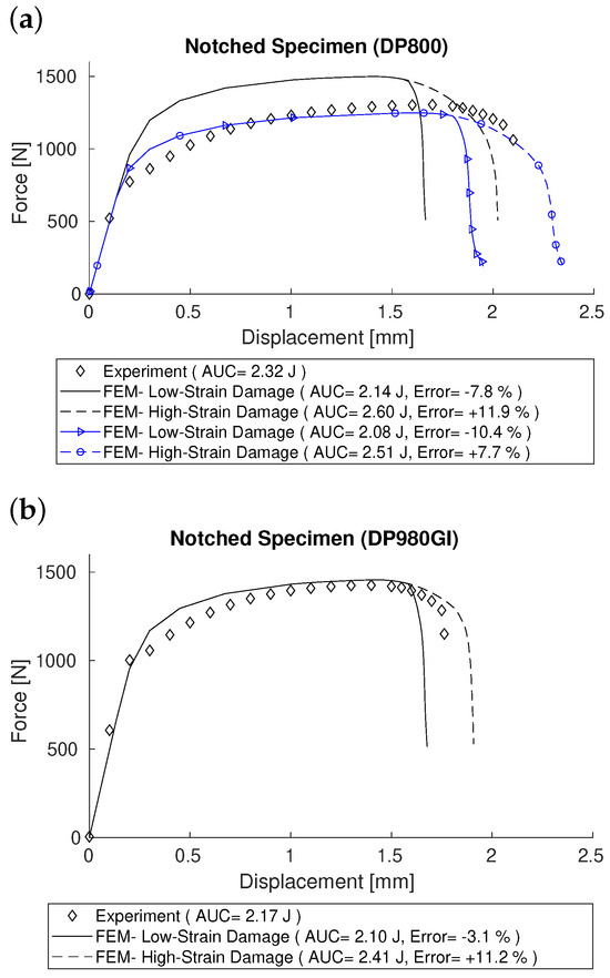 The goal of the following simulations and results is to determine whether changing the geometry affected the prediction of the stress–strain curve and the absorbed energy. To isolate the impact of geometry, every detail of the finite element and damage model was kept intact except for the tensile specimen’s geometry. Due to the use of non-standard and notched specimens from this point onward, force-displacement curves were considered the primary criteria to avoid the influence of post-processing on the data. This is especially important for notched specimens, where stress and strain calculations are highly subjective and depend on how gauge length and cross-sectional area are accounted for. Figure 15 shows the force–displacement curves for the miniature smooth dog-bone geometry for DP800 and DP980GI, comparing both the experimental and FE results. The absorbed energy values for this geometry are also provided in the figure legend. As shown, the low-strain damage set underpredicts the absorbed energy by 18%; however, the high-strain damage set obtained a much more accurate prediction of both failure strain and absorbed energy, with errors of less than 1% for DP800 and approximately 5% for DP980GI.