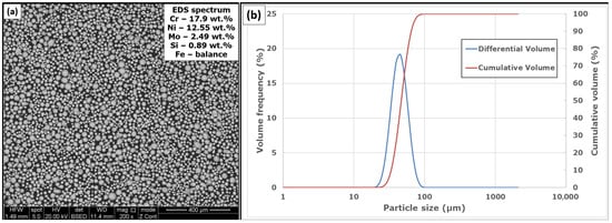 Experimental powder morphology analysis: (a) SEM image of powder particles with EDS spectrum and (b) particle size distribution with differential and cumulative volume curves (laser diffraction).