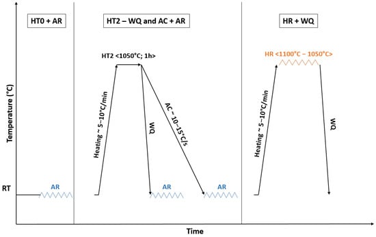 The thermomechanical processing routes applied to the different specimen sets are schematically illustrated in Figure 2. Four rolling strategies were implemented. The first set of specimens was ambient-rolled (AR) in the initial state without any prior heat treatment (HT0). The second and third sets were subjected to solution annealing at 1050 °C for 1 h (HT2), followed by either water quenching (WQ) or air cooling (AC, ≈10–15 °C/s), and subsequently AR. The fourth set was hot-rolled (HR). In this case, the material was preheated to 1100 °C to ensure a rolling temperature of 1050 °C. After hot deformation, the specimens were quenched in water (WQ). All rolling procedures were performed on an experimental DUO70 two-high rolling mill equipped with flat cylindrical rolls. The samples had initial dimensions of approximately 58 × 15.1 × 4 mm (length × width × thickness). The applied true plastic strain levels were , corresponding to thickness reductions of 0.4 mm, 0.6 mm, and 0.8 mm, respectively. The deformation levels were achieved through one or more passes, depending on the prior processing condition of each specimen (e.g., as-built, solution-annealed), to account for differences in workability and mechanical response. Rolling was performed in a single direction. The applied deformation levels were selected to investigate the minimum degree of strain required to significantly reduce porosity originating from the additive manufacturing process. The maximum deformation level of 20% was chosen based on the observed porosity evolution.