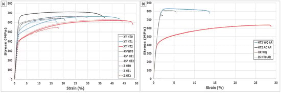 Stress–strain curves of proceseed samples: (a) as-built and heat-treated conditions tested in different orientations; (b) thermomechanically processed samples after 20% deformation.