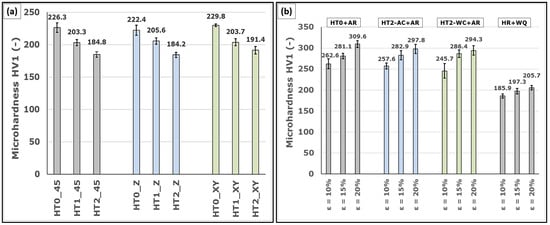 HV1 microhardness depending on processing conditions: (a) samples without plastic deformation in different build orientations and heat treatments; (b) Z-oriented samples after various thermomechanical processing routes and deformation levels.