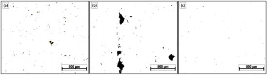 Analyzed micrographs (polished condition) used for porosity and pore morphology evaluation: (a) IS–HT0 in the Z-direction without deformation, (b) IS–HT2 in the Z-direction without deformation, and (c) HR–HT2 after HR.
