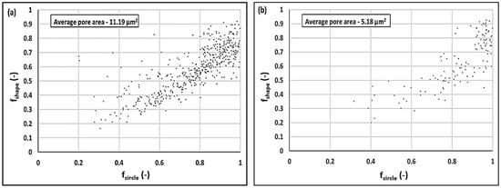 Quantitative porosity analysis involves measuring the volume fractions of pores and their dimensions, shape factors (e.g., circularity factor and shape factor), and aspect ratio [13,14,36,37,38]. These parameters can be extracted from microscopic images using digital image analysis, yielding a comprehensive view of the material’s internal structure. These measurements are crucial because various pore morphologies influence failure mechanisms in distinct ways. For instance, spherical pores are generally less detrimental to crack propagation compared to sharp-edged or elongated (ellipsoidal) pores [14,15,36,39]. Total volume porosity above 0.3–0.5% can represent a critical threshold for a sudden decrease in ductility, especially in applications subjected to cyclic loading [40]. Shape factors, such as the circularity factor, are important for predicting the probability of crack initiation—pores with lower circularity (sharp edges) have a higher fracture potential. The aspect ratio indicates the elongation of the pores and their orientation, which is important in the anisotropic behavior of the material [14].