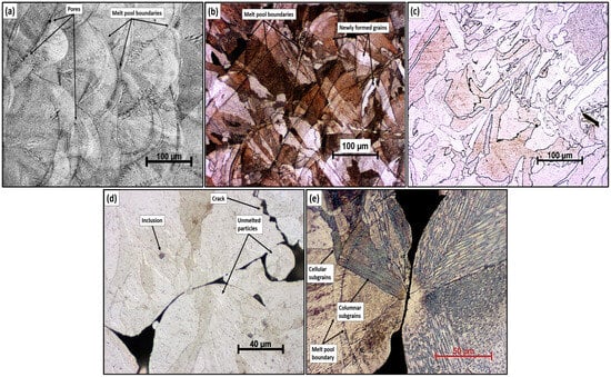 Optical micrographs of AISI 316L stainless steel produced by L-PBF in the Z-direction under different heat treatment conditions: (a) as-built condition (HT0), (b) HT1 condition, (c) HT2 condition, (d) detail from the HT2 condition showing a lack of fusion defect, and (e) another region from HT1 highlighting well-defined cellular and columnar subgrains.