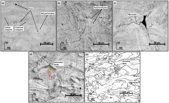 Optical micrographs of AISI 316L stainless steel produced by L-PBF after different rolling conditions: (a) as-built HT0 condition, AR by ε = 20%; (b) HT1 condition, AR by ε = 20%; (c) detail of the HT1 and AR by ε = 20% showing a pore with a microcrack; (d) HT2 condition and AR by ε = 20%; (e) HR condition by ε = 20% and subsequent water quenching.