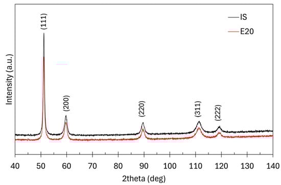 X-ray diffraction (XRD) analysis was performed on samples in the as-built condition without heat treatment (IS) and after 20% AR (E20), both corresponding to the HT0 condition. The diffractograms shown in Figure 9 confirm the presence of a face-centered cubic (fcc) austenitic phase in both conditions. No secondary peaks indicative of deformation-induced martensite were detected, suggesting that the austenitic matrix remained stable even after 20% plastic deformation.