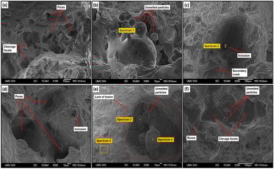 The fractographic analysis of fracture surfaces after the tensile testing of undeformed conditions is shown in Figure 10. The results reveal significant differences in fracture mechanisms and defect types depending on the applied heat treatment.