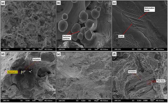 Hot rolling significantly altered the fracture behavior of the material under tensile loading. The fracture surface exhibited a ductile character, characterized by well-developed dimples. The observed pores were smaller, mostly spherical, and uniformly distributed throughout the matrix. In addition, flow lines typical for hot-deformed material are evident in Figure 11f, indicating substantial plastic deformation and improved microstructural homogeneity.