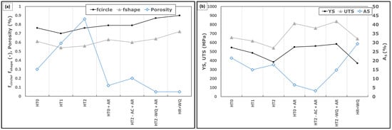 Significant changes were also observed in the HR + WQ condition, where hot deformation was applied, followed by rapid cooling in water. The HR + WQ condition revealed microstructural features indicative of dynamic recovery and partial recrystallization. Optical microscopy revealed evidence of subgrain formation and deformation bands aligned with the rolling direction, characteristic of hot working at elevated temperatures. These features suggest that recovery processes dominated during hot deformation, resulting in the rearrangement and annihilation of dislocations. In some regions, newly formed recrystallized grains were observed, supporting the occurrence of dynamic recrystallization during rolling. This microstructural evolution facilitated pore closure and improved morphological uniformity, as well as contributed to the observed reduction in hardness and enhancement of ductility. Already at 10% deformation, the porosity reduced to 0.20% and at 20% to 0.05% while the value also decreased significantly (from 1.86 to 1.57). This condition also showed the best morphological parameters of the pores ( up to 0.90). There was a noticeable softening of the matrix due to the influence of high temperature, which facilitated the closure of the pores during rolling. Similar results were also reported in a study from [65], where high-temperature deformation combined with rapid cooling significantly eliminated interporous stress concentrators. These results demonstrate the gradual improvement of pore morphology, especially in terms of increased sphericity and reduced shape irregularity, which correlated with the observed reduction in total porosity. Figure 12a provides a comparison of , , and porosity across all processing states, highlighting the advantage of combined thermal and mechanical treatment (HT2 − WQ + AR, HR + WQ).