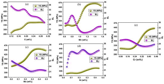 The analysis revealed that the carbon content (Figure 10a) significantly influenced both strength and ductility. As carbon content increases from 0.12 to 0.32 wt%, the yield strength initially increased from approximately 290 MPa to a peak of 355 MPa at approximately 0.24 wt%, and then slightly decreased. Conversely, elongation showed an inverse relationship, decreasing from 32% to 24% as the carbon content increased. This behavior is attributed to the formation of carbides at higher carbon contents, which enhances the strength but reduces ductility [,].