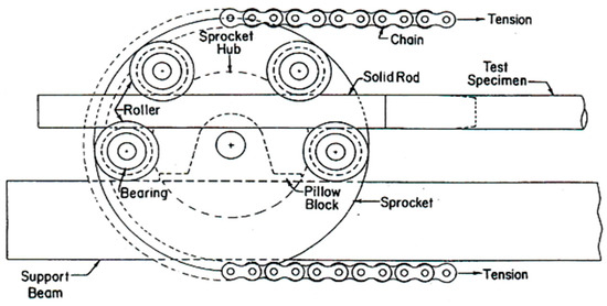 Figure 2 shows the four-point bending machine employed for the cyclic bending tests. The apparatus features two rotating sprockets mounted on supporting beams, connected by a durable chain that provides structural integrity. The system is capable of accommodating specimens up to 1 m in length. As depicted in Figure 3, square tubes were fitted with solid rod extensions at both ends to facilitate secure mounting during testing. During bending, the interaction between the tube and the rollers permitted unrestricted axial movement. Bending loads, applied in both forward and reverse directions, were introduced via two concentrated forces exerted by a pair of rollers. In forward bending, two rollers on each sprocket applied force to the solid rod extensions. In reverse bending, the alternate set of rollers on each sprocket delivered the force. The transition to forward bending was triggered by retracting either the upper or lower hydraulic cylinder, which, in turn, caused the sprockets to rotate. Reverse bending was achieved by reversing the flow direction of the hydraulic circuit [27].