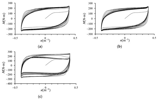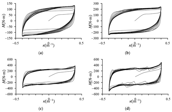 During the initial loading stage, the square tubes remained within the elastic regime, resulting in a linear increase in the M with respect to κ. As κ increased further, plastic deformation commenced, causing the rate of increase in M to diminish and resulting in permanent deformation. All M–κ curves exhibited cyclic hardening and stabilized after a few cycles.
