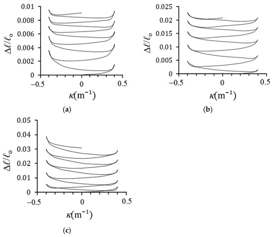 Figure 13a–d show the Δℓ/ℓo-κ curves for square tubes subjected to cyclic bending with varying outer side lengths (ℓo = 20, 30, 40, and 50 mm) at a fixed orientation angle (Φ = 0°). Figure 14a–c illustrate the corresponding Δℓ/ℓo-κ relationship curves for square tubes with a fixed ℓo of 30 mm and varying orientation angles (Φ = 0°, 22.5°, and 45°). The curvature κ ranged from +0.4 m−1 to −0.4 m−1. In all cases, the Δℓ/ℓo-κ curves displayed nonlinear behavior, whether the deformation was elastic or plastic. As κ increased during loading, Δℓ/ℓo also increased, reaching its maximum at κ = +0.4 m−1. Upon unloading, Δℓ/ℓo decreased but did not return to zero at κ = 0 m−1, indicating residual plastic strain. With continued reverse loading, both κ and Δℓ/ℓo increased again, peaking at κ = −0.4 m−1. After returning to κ = 0 m−1, Δℓ/ℓo was slightly higher than in the previous cycle, reflecting the accumulation of plastic deformation. This progressive increase in Δℓ/ℓo continued with additional loading cycles. The Δℓ/ℓo curves also demonstrated symmetry, ratcheting behavior, and incremental growth with cycling. At a given κ, higher ℓo or Φ values resulted in larger Δℓ/ℓo. Because these trends were consistent, further testing with additional ℓo or Φ values was considered unnecessary.