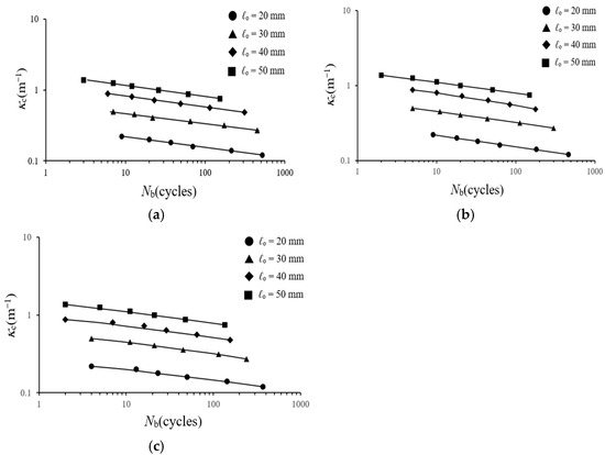 Figure 15a–c show the κc–Nb relationships of square tubes under cyclic bending for various ℓo values and bending directions (Φ = 0°, 22.5°, and 45°), plotted on double logarithmic scales. The straight lines in the plots represent least-squares regression results. For each bending direction, the four ℓo values correspond to four distinct linear trends. At fixed Φ and ℓo, the number of cycles to buckling (Nb) decreased with increasing critical curvature (κc). Similarly, for fixed Φ and κc, a larger ℓo resulted in a higher Nb. Conversely, at fixed ℓo and κc, Nb showed a slight decrease as Φ increased. It is worth noting that, for each κc value, two specimens were tested, and the resulting Nb values showed minimal variation, indicating good consistency.