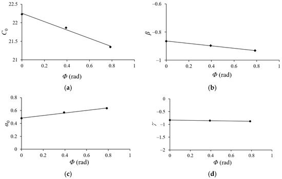 (a) Relationship between Co and Φ, (b) relationship between β and Φ, (c) relationship between αo and Φ, and (d) relationship between γ and Φ.