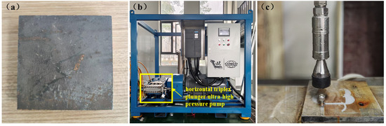 Materials and equipment. (a) Grade-A marine steel, (b) ultra-high-pressure water jet impact experimental platform, and (c) rotary nozzle.