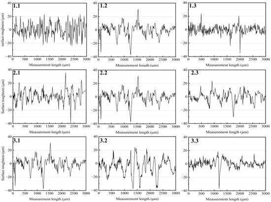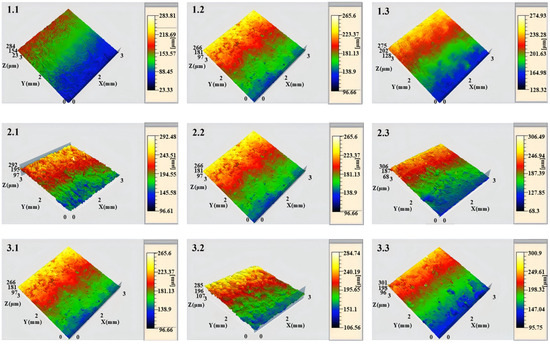 Figure 2 (Specimen number 1.1–3.3 shown in Table 2) presents the surface topography of the grade-A marine steel under different jet parameters in the single-factor experiments. All specimens exhibit undulating surfaces with varying degrees of height fluctuations. Notably, Specimens 1.2, 2.2, and 3.1, representing the same test piece under distinct parameter sets, demonstrate relatively smoother surfaces compared to the others, achieving a balance between controlled roughness and morphological uniformity. Figure 3 (Specimen number 1.1–3.3 shown in Table 2) illustrates the variations in surface roughness at the central position of the specimen under different jet parameters, while Table 4 (Specimen number 1.1–3.3 shown in Table 2) quantifies the corresponding roughness values. Based on the data in Table 4, a bar chart (Figure 4) was generated to visualize the surface roughness distribution of grade-A marine steel after the single-factor experiments.