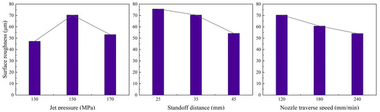 In range analysis, Tjm represents the average value of Kjm, where a higher Tjm indicates a stronger influence on the experimental outcomes. Rj, defined as the difference between the maximum and minimum Tjm, quantifies the magnitude of each factor’s effect—a larger Rj corresponds to a more significant impact. The hierarchical order of influencing factors can be determined by comparing Rj values. To investigate the effects of jet pressure, standoff distance, and nozzle traverse speed on surface roughness in ultra-high-pressure water jet processing, range analysis was applied to the orthogonal experimental results in Table 5. The derived range analysis results for surface roughness are summarized in Table 6, revealing the relative significance of each process parameter.